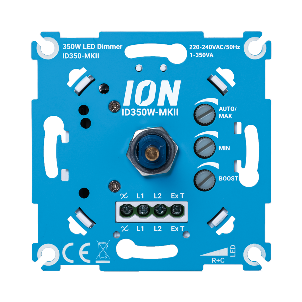 De ION LED dimmer ID350W-MKII is het nieuwe top model dimmer van ION INDUSTRIES. Deze dimmer is een upgrade van de ID300 met de nieuwste technieken en instelmogelijkheden. Tevens heeft deze dimmer een extra max. 600W uitgang die gebruikt kan worden om bijvoorbeeld een fan of andere groep aan te sturen.